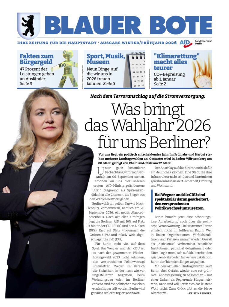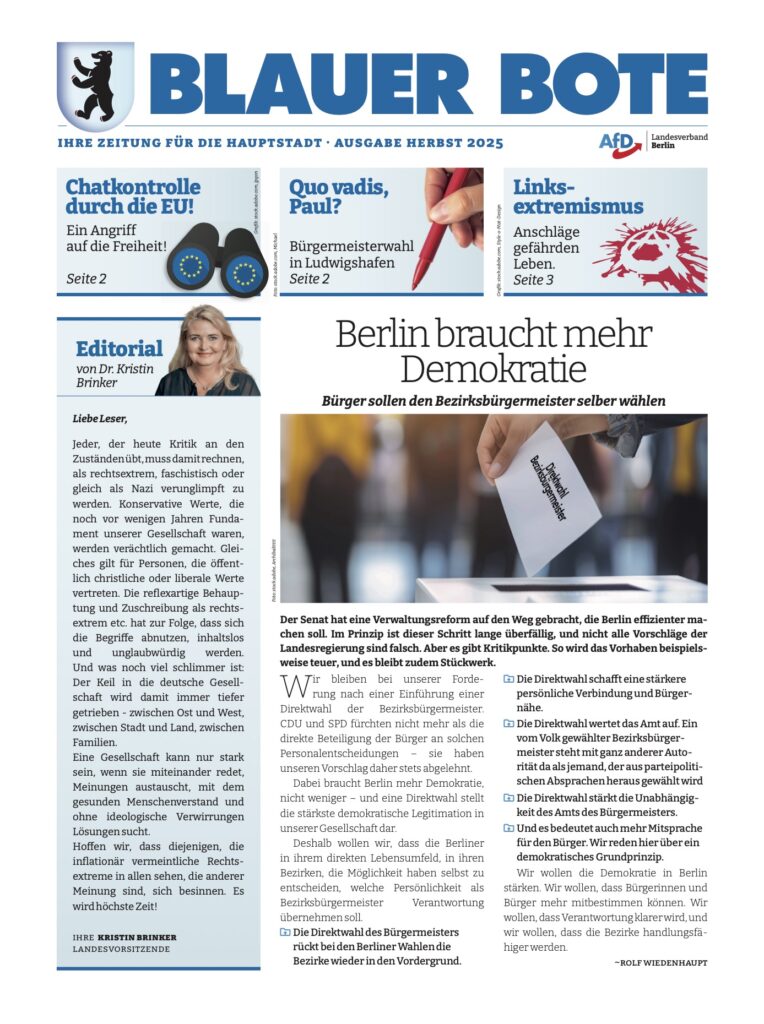 Der Blaue Bote ist unsere regelmäßig erscheinende Zeitung für die Hauptstadt, mit der Sie sich aus erster Hand über unsere politische Arbeit informieren können.